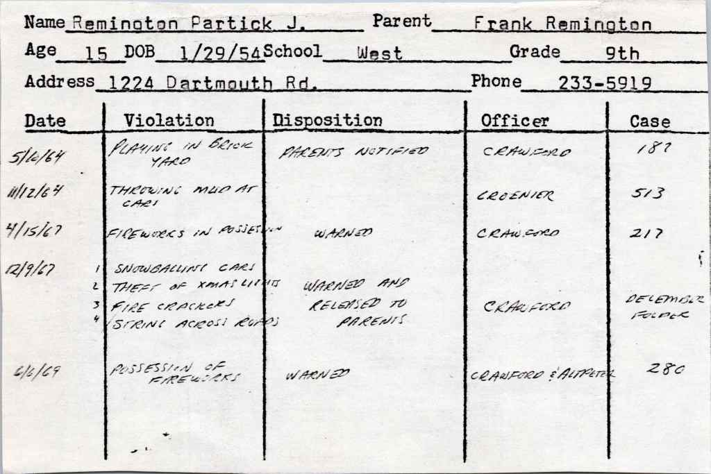 My pyrotechnics did not go unnoticed however by our village police. When I was 13 years old I was charge with “FIREWORKS IN POSSESSION” and given a warning by Officer Dan Crawford–shown here on my police rap sheet: