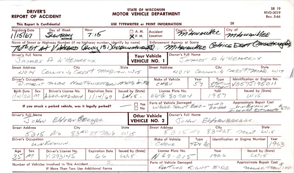 More detail was provided about the accident, in a letter written by Jim to his insurance company on January 17th: “Sunday evening January 15, 1967, we were leaving Cedarburg, Wisconsin to return to Madison after a Sunday visit with my sister. We were traveling South on Hwy. 181… about 7:15 to 7:30 PM. We were approaching Villard and 76th traveling about 30 mph and all of a sudden, an auto was in front of my car.