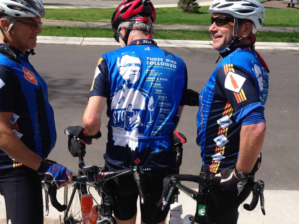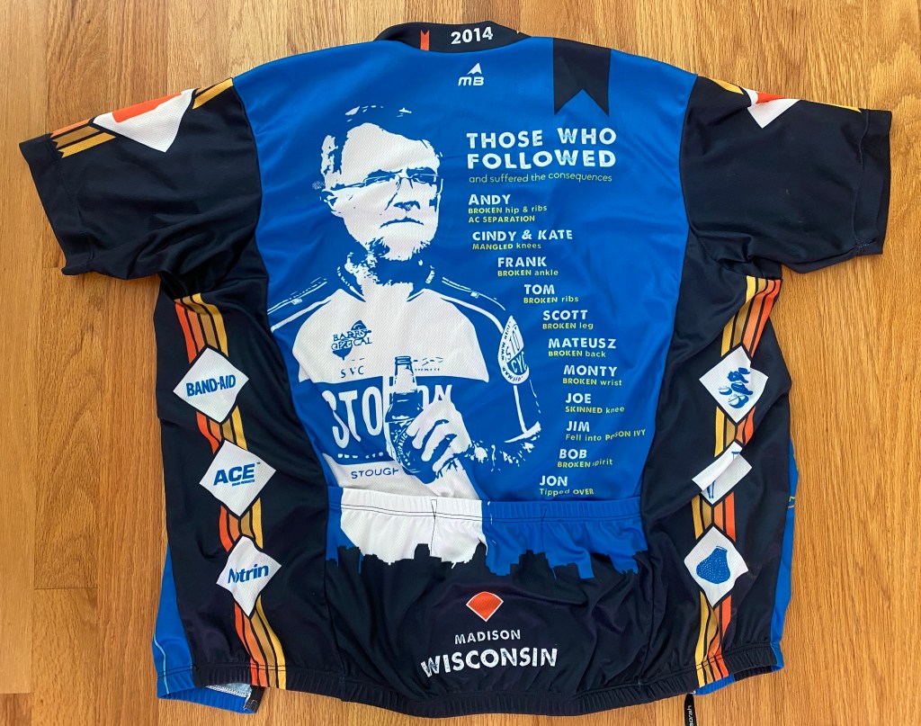 Then about a decade ago, another friend had bike jerseys made that also said “Don’t Follow Pat,” and went further to list the names and injuries of all “those who followed and suffered the consequences.” During our annual “Midwest Epic” mountain bike ride, one day is “jersey day” when we all wear that jersey.